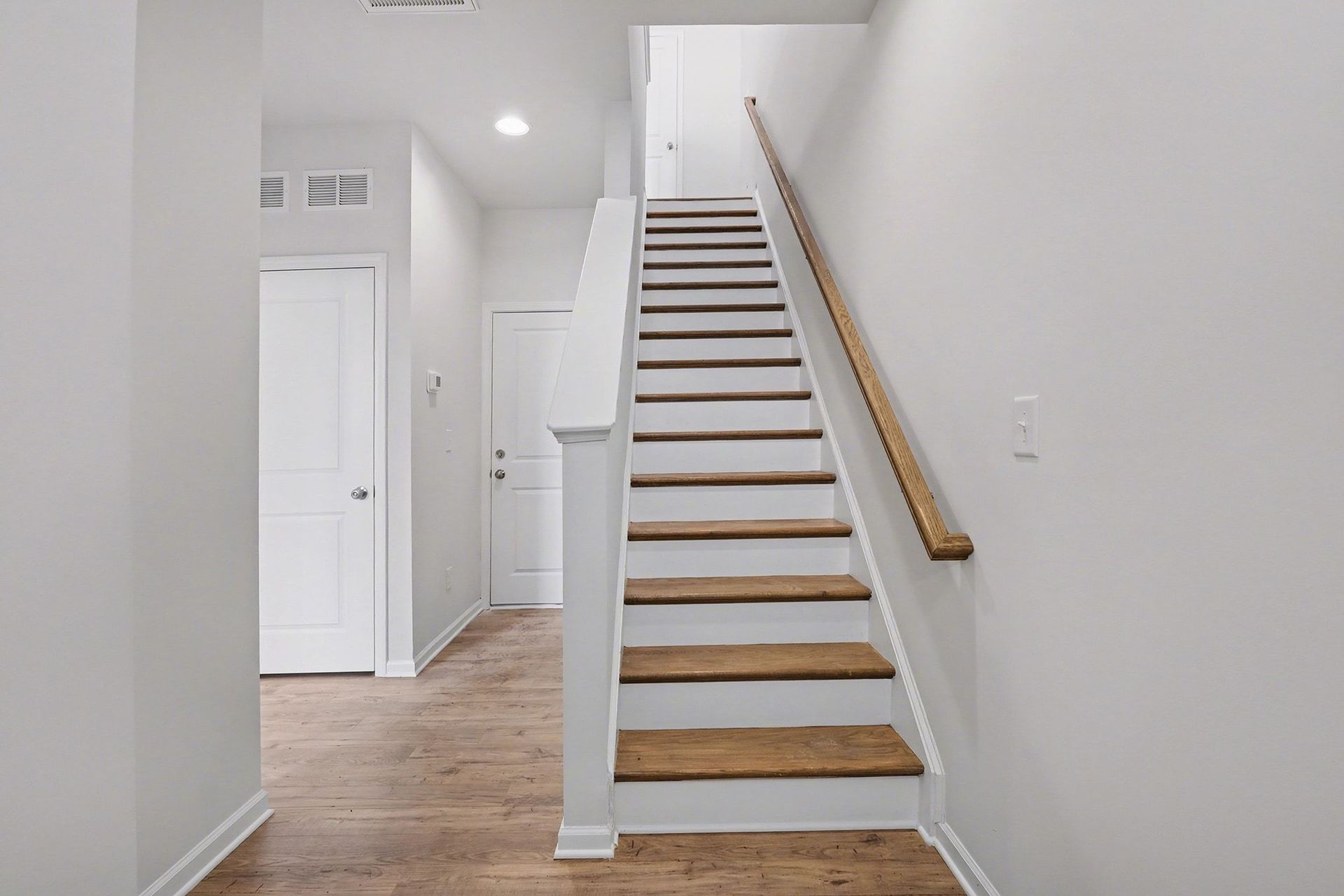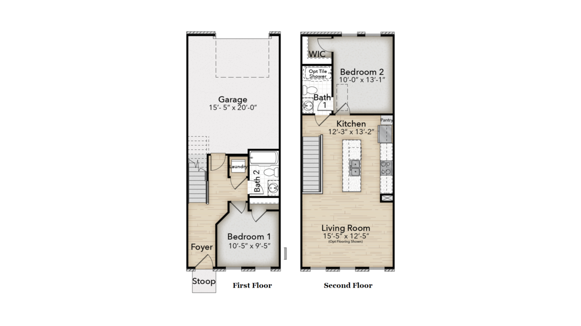 The Berkley features two stories with approximately 958 square feet of heated space. First floor features bedroom with full bath, laundry and 15'x20' one car attached garage. On the second floor is the kitchen with large breakfast bar, main bedroom with walk-in closet and main bath.