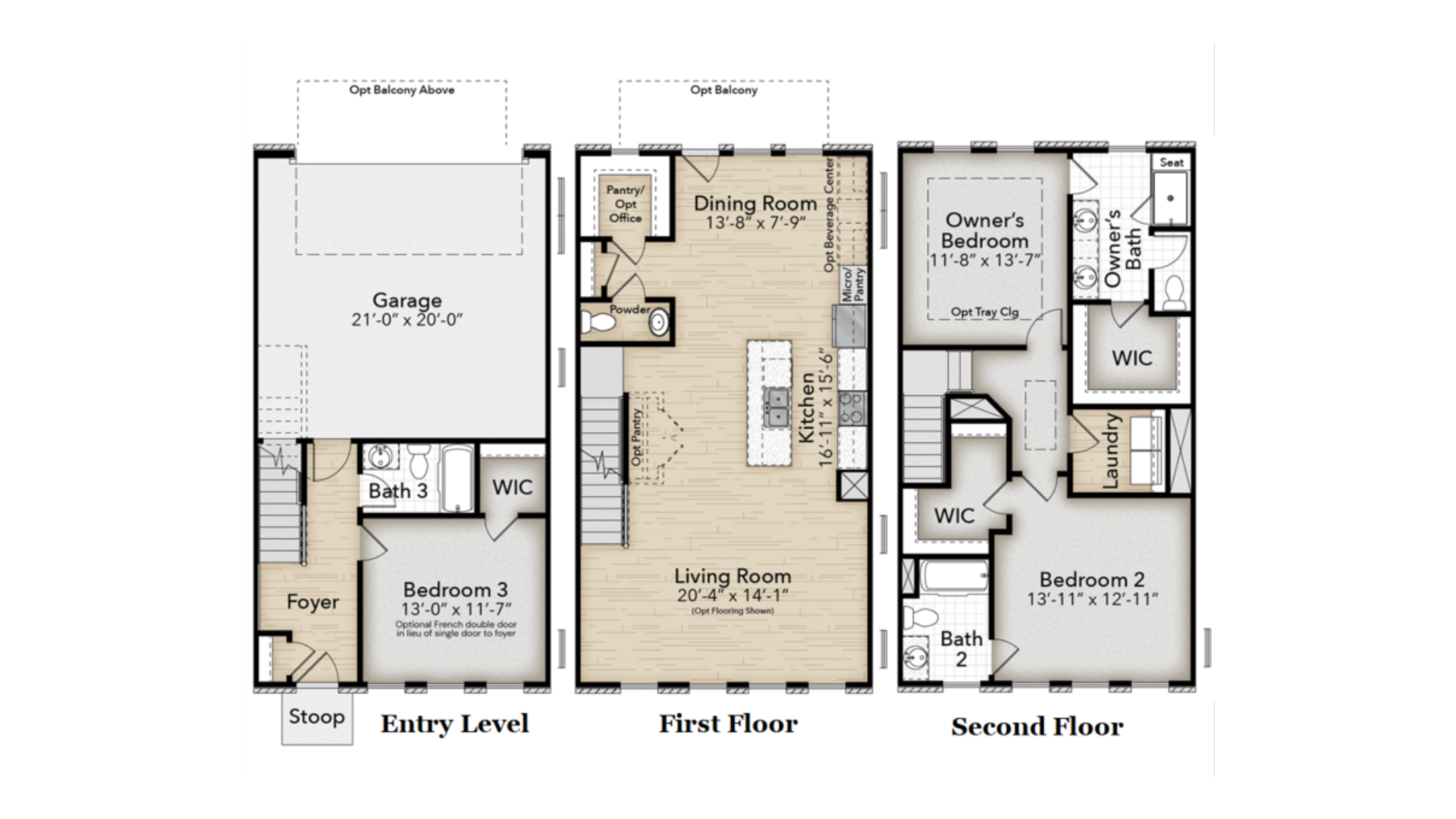 The Charlestown offers flexible three-level living designed to meet today’s lifestyle needs. The ground floor features a private 2-car garage, entry foyer, and a guest suite with full bath. On the main level, a large open-concept living room flows into a designer kitchen with oversized island, walk-in pantry, and a spacious dining area with access to the covered balcony. Upstairs, the owner’s suite includes a private bath with a double vanity and walk-in shower and a large walk-in closet, while a secondary bedroom and full bath offer comfort for family or guests.